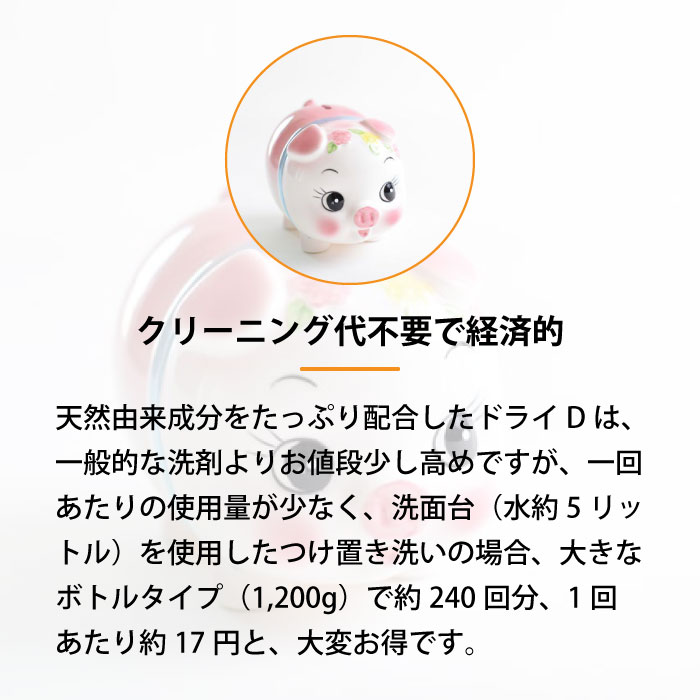 ドライDは1回あたりの使用量が少なく、洗面台を使用したつけ置き洗いでボトルタイプ1200g入ドライDを使用した場合、約240回も使えて大変お得です。