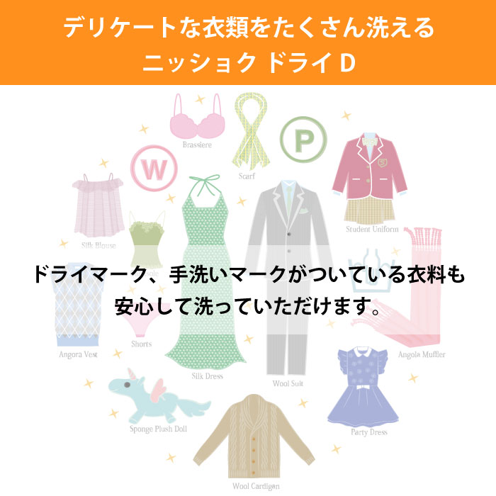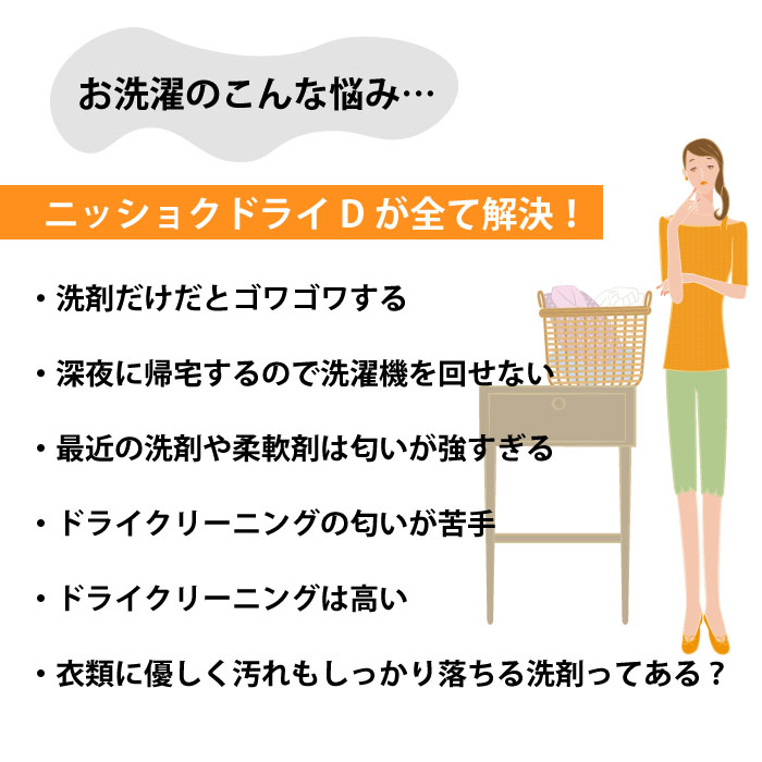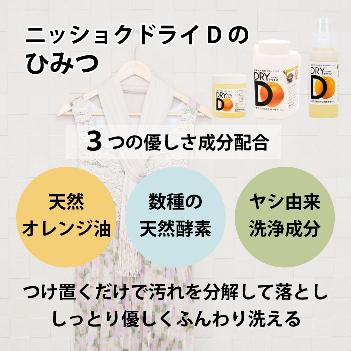 ニッショクドライDは、ドライマークおしゃれ着がご家庭で簡単に洗える、天然オレンジ油、数種の天然酵素配合のおしゃれ着洗剤です。