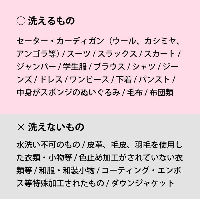 洗濯機のドライコースで回し洗いしていただいても、シワになりにくくふんわり洗い上がります。(特にデリケートな衣類や、頑固な汚れがある場合には、つけ置き洗いがおすすめです)