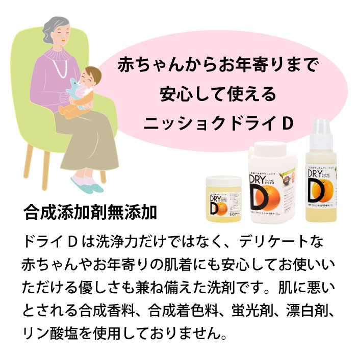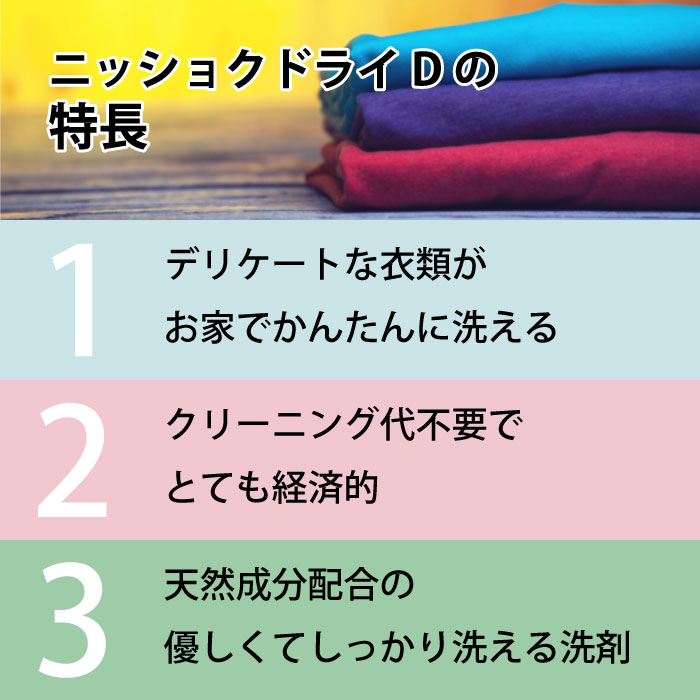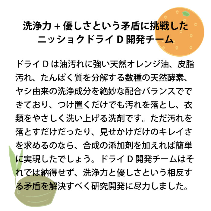 ニッショクドライDは、ドライマークおしゃれ着がご家庭で簡単に洗える、天然オレンジ油、数種の天然酵素配合の無添加洗濯洗剤です。