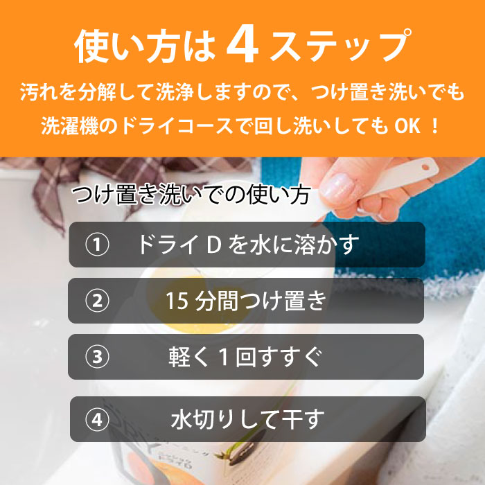 つけ置くだけでも汚れを落とす驚きの洗浄力!洗濯機のドライコースで洗ってもOK!優しい成分が衣類を守り、ドライマークなどのおしゃれ着を簡単に洗うことができます。